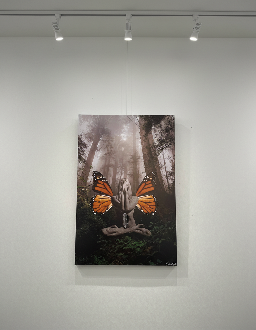 “Ground Yourself and Your Spirit Will Fly” is a surreal composite photographic image showing a woman in mediation within a foggy forest, with monarch wings emerging from her back. The image visualizes the title’s message, deep earthly grounding is the very foundation that allows for spiritual ascension. This piece serves as an intentional reminder that of the universal human capacity for inner stillness and transcendent freedom.