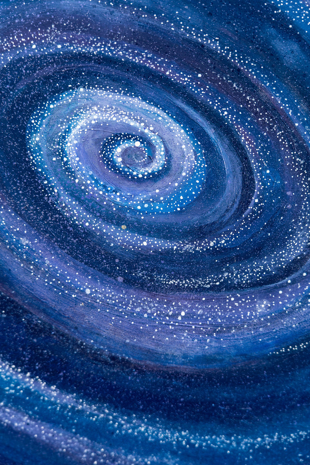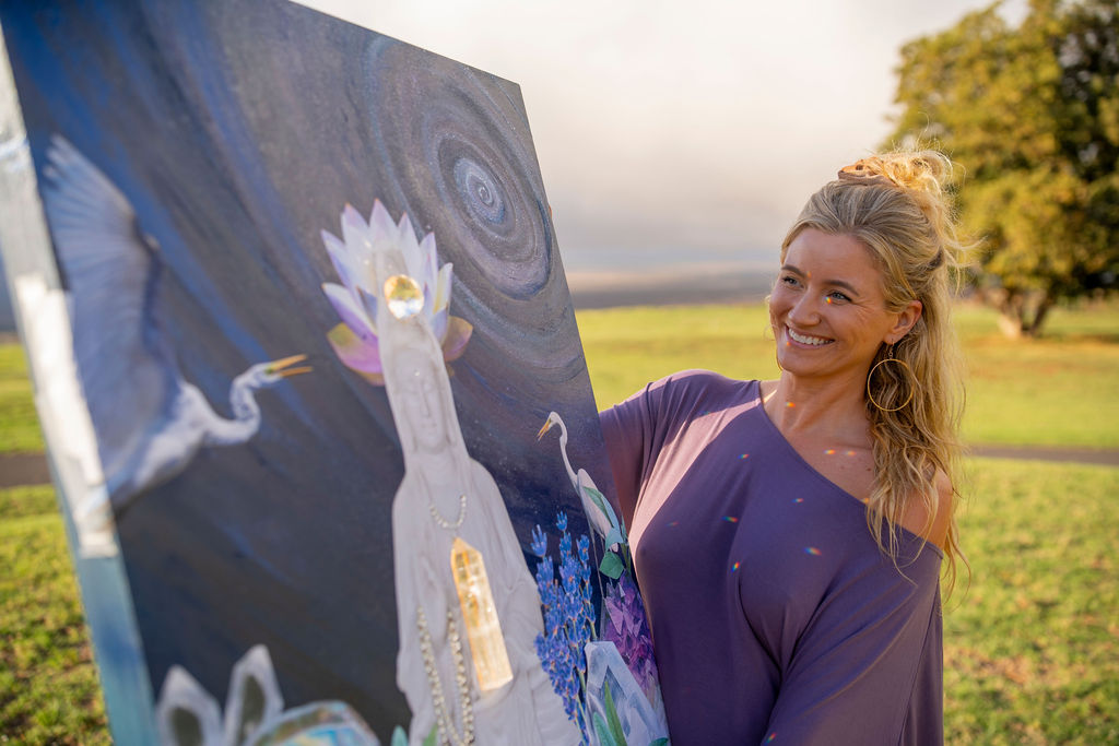 Quan Yin Compassion” is a mixed media sanctuary depicting the Bodhisattva of Mercy, sitting under a painted galaxy of stars while resting on a bed sage, lavender, quartz, and amethyst, elements that connect the viewer to her serene healing frequency. A crystal embedded in her crown radiates light from behind, transforming ambient light into ethereal rainbow reflections. This luminous interaction with light, along with layered symbolism like the guiding white cranes, create a piece where viewers are invited to experience the vibrations of Quan Yin, her boundless inner peace, and compassion for humanity.